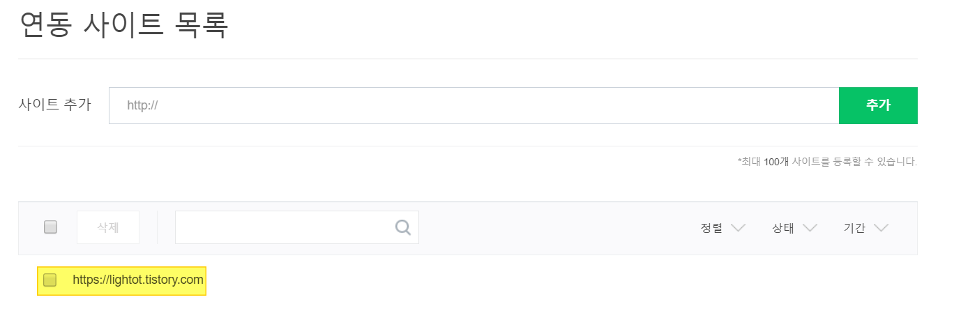 접속하시면 아래와 같은 연동 사이트 목록을 보실 수 있고 1단계에서 등록한 블로그가 보입니다.